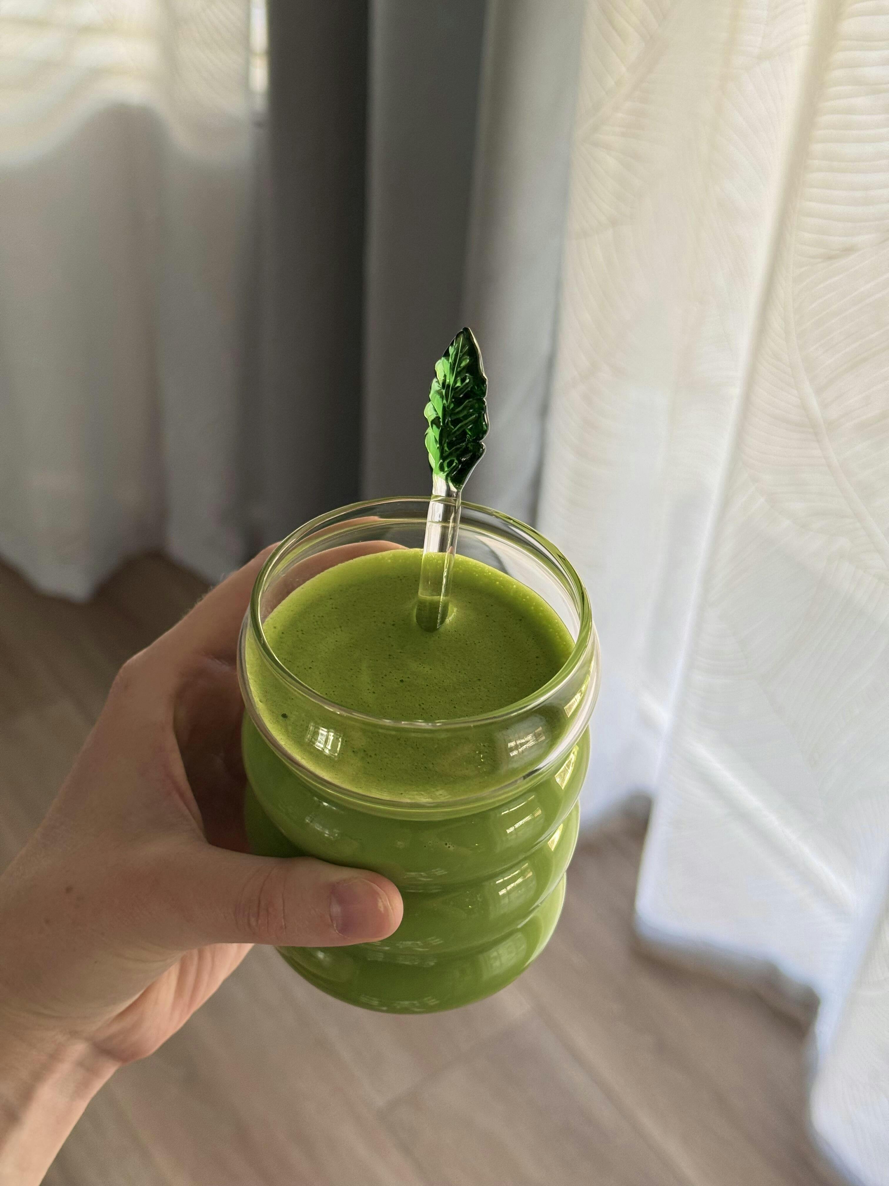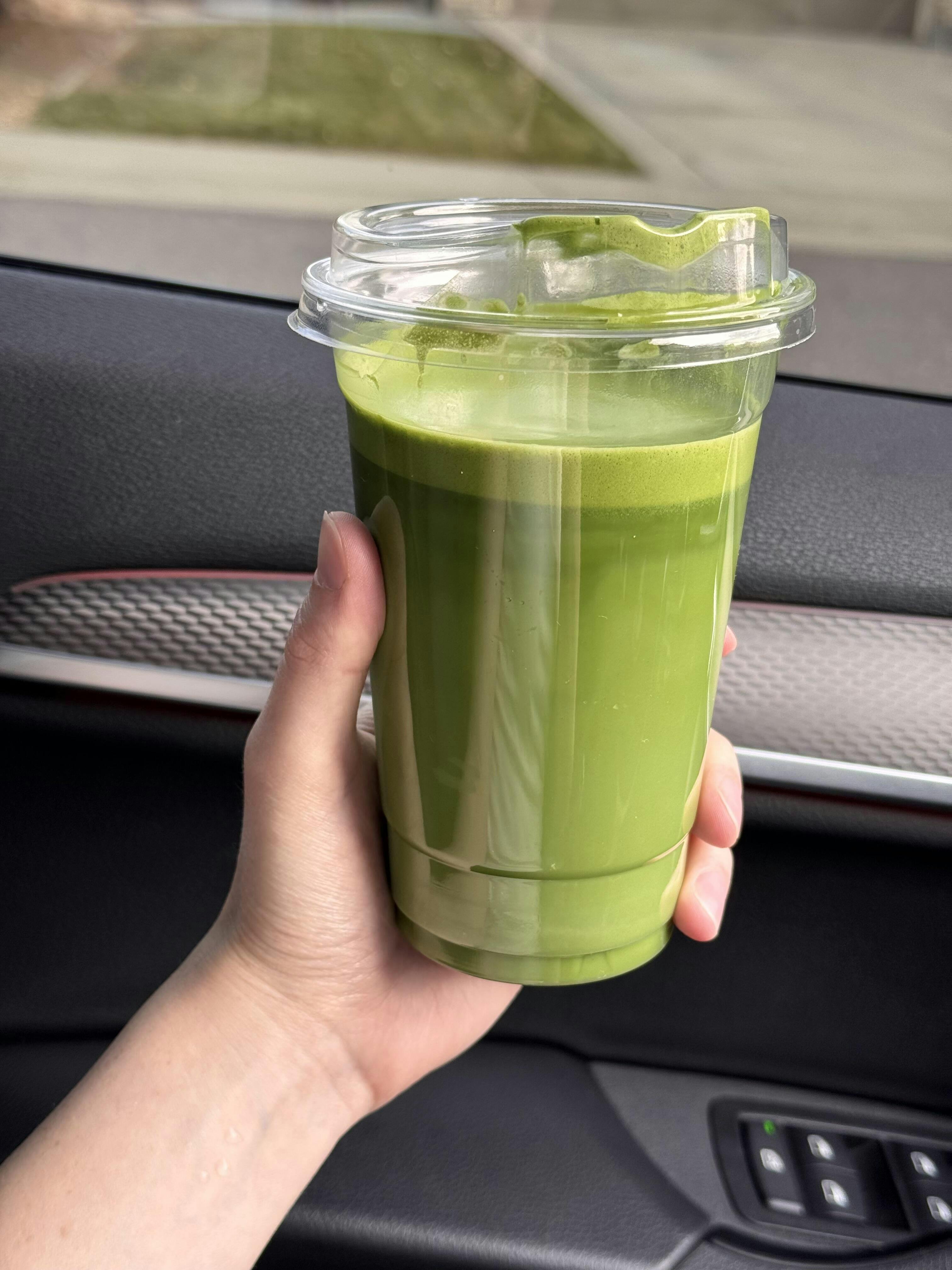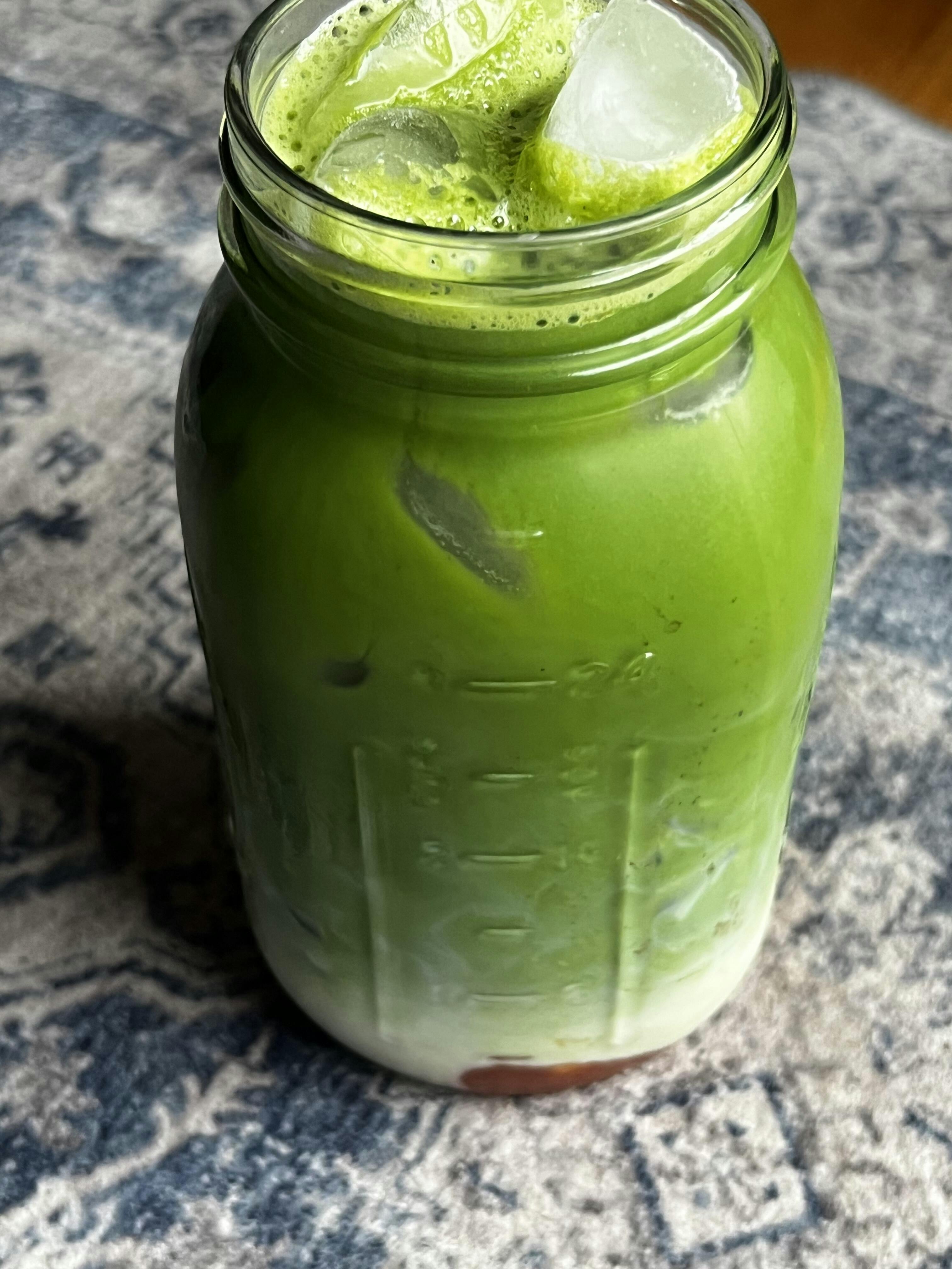 In my photos you can see the color of matcha in my latte is bright green color, there is no filter on the photo, so that’s a true color. I make my latte with oat milk and my homemade vanilla brown sugar syrup.